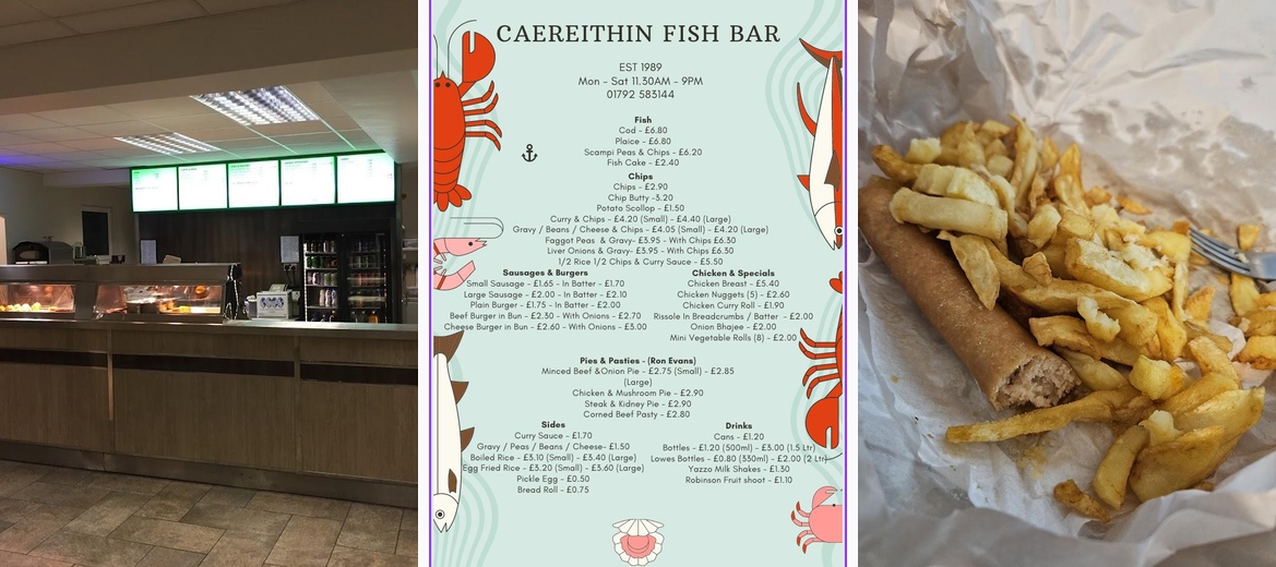 Caereithin Fish Bar excels in fish and chips, but don't miss the potato scallops and curry & chips. They serve a variety of options from cod to sausage in batter, ensuring everyone finds something to love.
